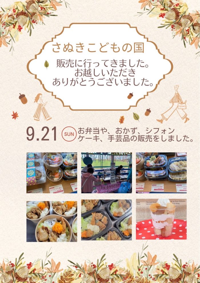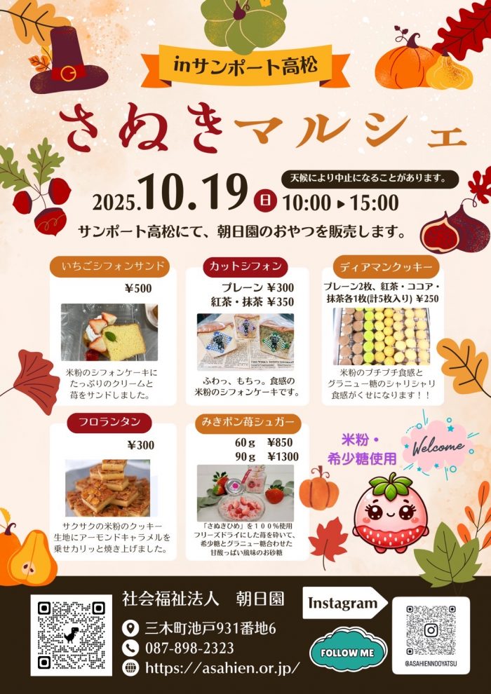 朝日園トップページ 新着情報 トピックス,朝日園 🍁マルシェ告知🍁 9/21日曜「さぬきこどもの国」のバザー販売に参加しました。たくさんのお客さまが来られて大盛況でした!お買い上げいただいた方、ありがとうございました。 次回のお知らせです 10/19日曜、サンポート高松にて開催の「さぬきマルシェ」に参加します。秋も深まるこの季節、おいしいお菓子はいかがですか? シフォンケーキが人気ですが、フロランタンもおすすめです。希少糖を使った苺シュガー「みきぽんいちごシュガー」も販売します。 それではサンポートでお待ちしていまーす🍂 2025年10月10日 12:30 PM | カテゴリー:トピックス, 朝日園 « 🎈朝日園 地域交流ふれあい秋祭りのお知らせ🎈