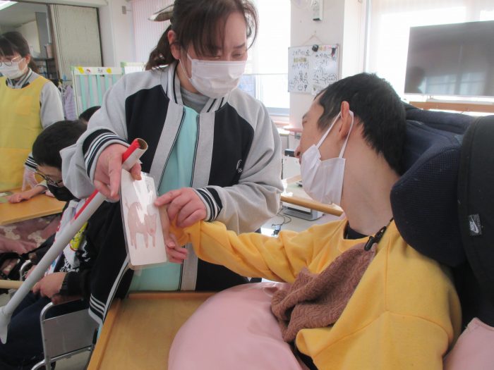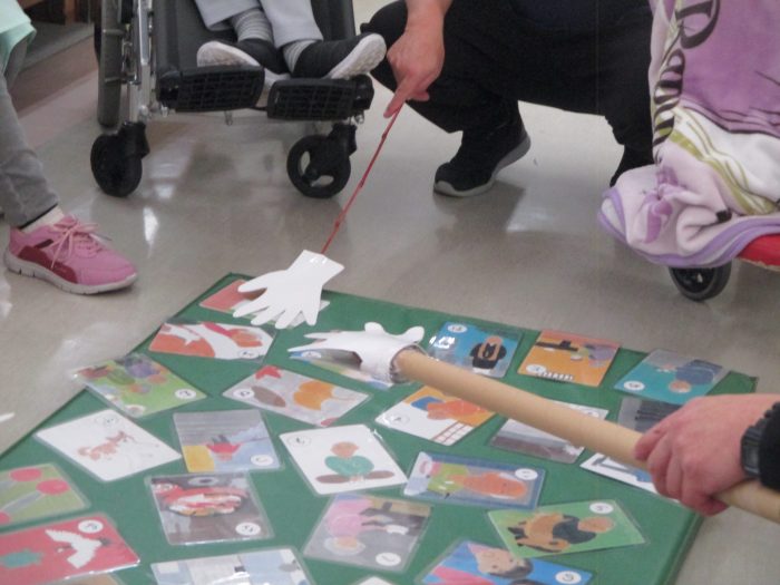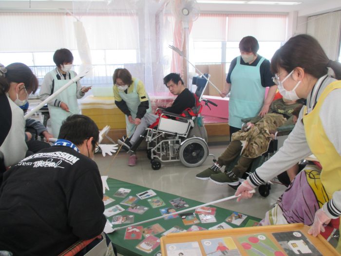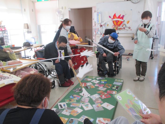 2月13日にお楽しみ会にて、カルタ大会を行いました。職員と利用者さんで協力しながら行い、時には皆さん真剣な表情で札を探し、素早く手を伸ばして取っていました。